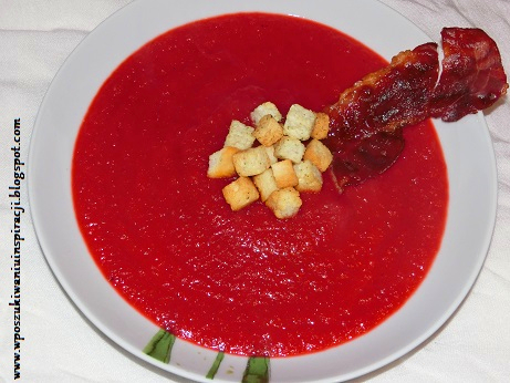 Cały dzień kręcę się po kuchni i wymyślam, w co by tu ręce wsadzić. Mój mężczyzna wyjechał, a ja postanowiłam podczas jego nieobecności spędzić czas jak najbardziej kreatywnie. Zazwyczaj nie chce mi się gotować dla jednej osoby, ale stwierdziłam, że warto wykorzystać ten czas na przygotowywanie dań, których mój ukochany nie jada. I tak właśnie powstał krem z buraczków. Bardzo dawno nie jadłam zup, postanowiłam więc zacząć właśnie od tej. Wyszła smaczna, bardzo gęsta i sycąca. Chips z szynki szwarcwaldzkiej to istna wisienka na torcie.