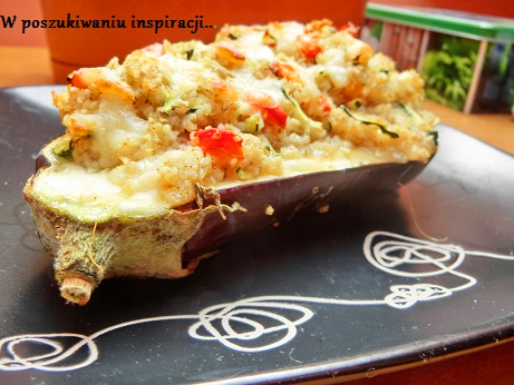 Bakłażan faszerowany kaszą jęczmienną i warzywami.
